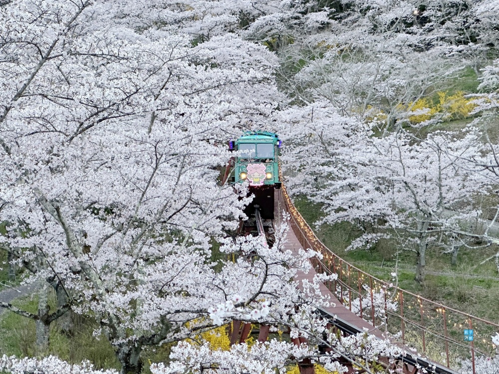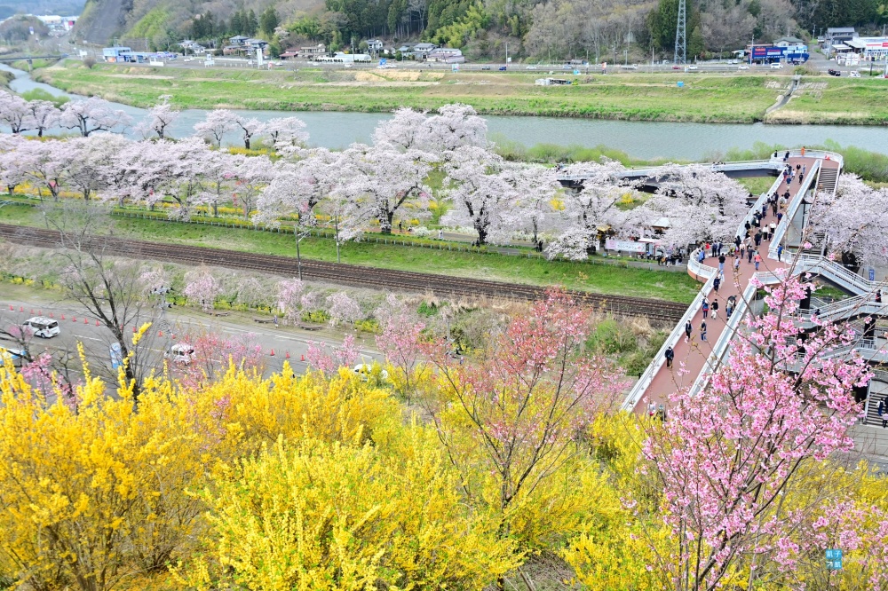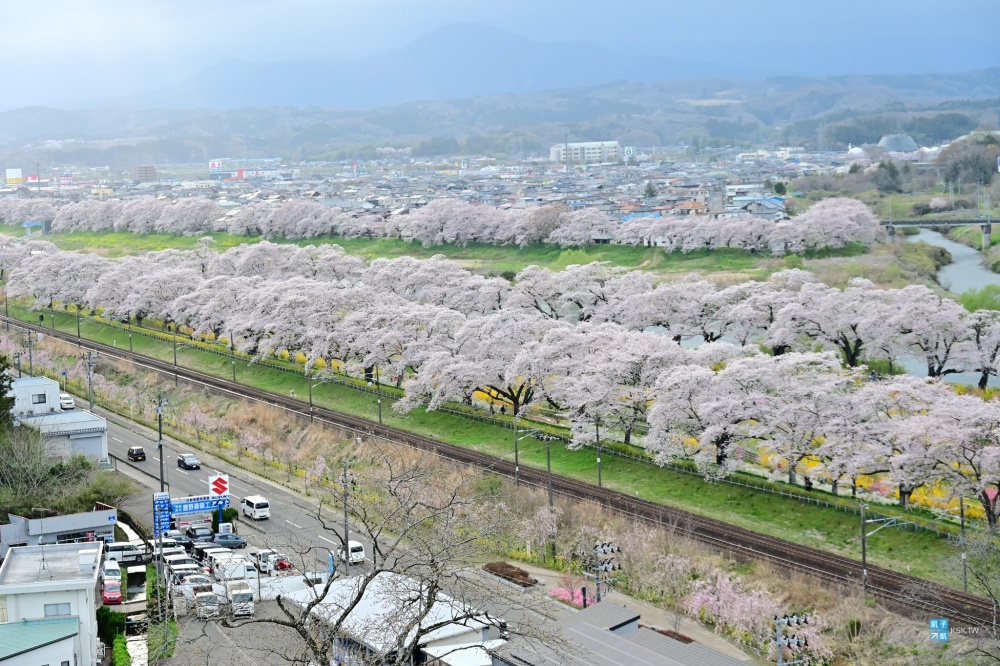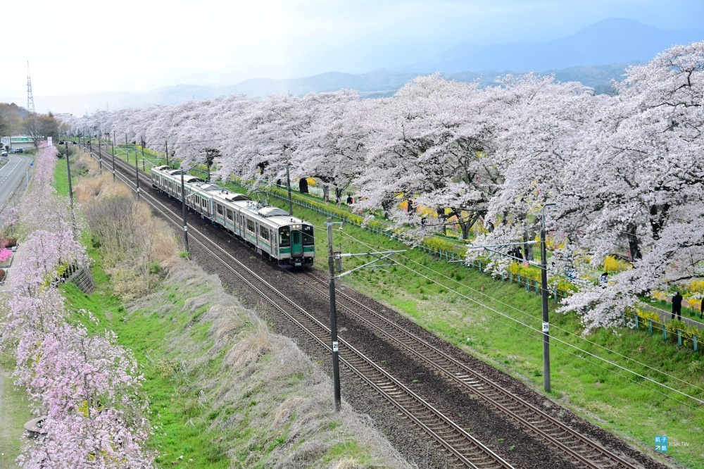其中最重要的拍攝點莫過於「柴田千櫻橋」這邊,天氣好的話,可以拍到藏王連峰搭配電車與一目千本櫻的畫面。