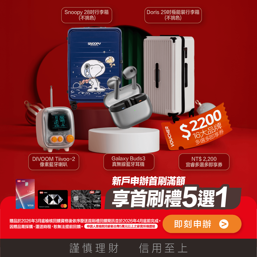 申辦滙豐Live+現金回饋卡、匯鑽卡或現金回饋御璽,並勾選電子帳單或行動帳單,並於核卡30天內登入滙豐銀行信用卡行動App(HSBC Card+)、新增一般消費累積達$5,000元,可獲得通路限定首刷禮(多選一):首刷禮 Snoopy 28吋前開上掀式行李箱/ Galaxy Buds3 真無線藍牙耳機 / DIVOOM Tiivoo-2 像素藍牙喇叭/ 2,200元即享券 / Doris 29吋行李箱
