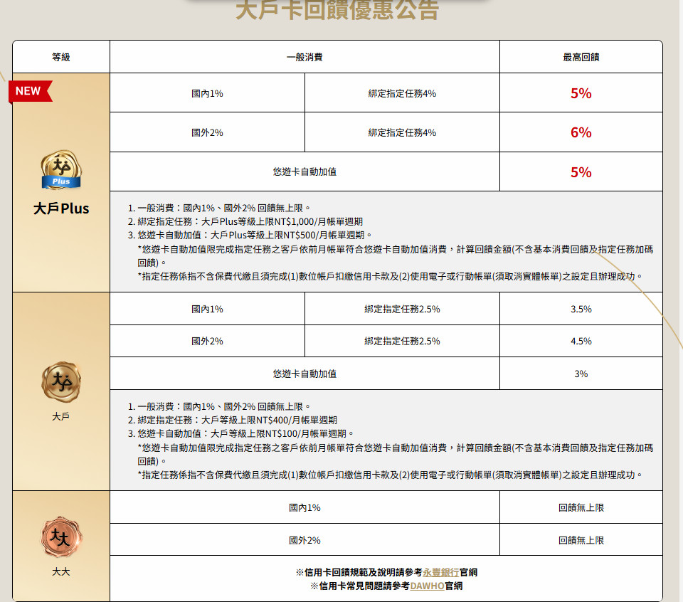 詳細可參考:永豐大戶卡 (DAWHO現金回饋信用卡):「大戶」等級說明、國內3.5%、國外4.5%回饋無腦刷神卡