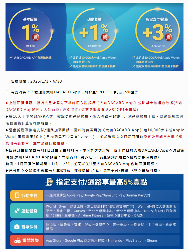 二、活動內容:新戶核卡後45日內一般消費綁定Apple Pay / Google Pay / Samsung Pay / Garmin Pay支付享20%刷卡金回饋(限量)※本活動限2026/1/1 – 6/30申請進件(以本行收件日為準),並於2026/7/15前核卡者,SPORT卡回饋上限1,800名,回饋額滿活動即提前終止。