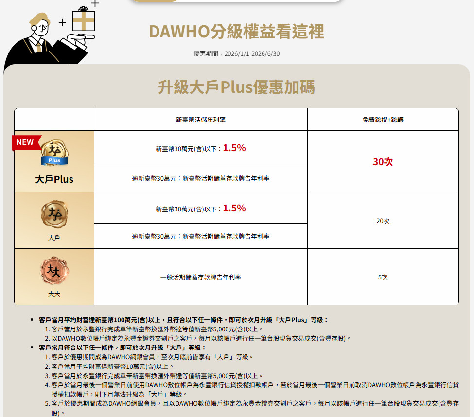 永豐弄出了一個「大戶Plus」的新等級,門檻算是蠻高的,我想您看了介紹之後,大多數人會覺得興趣缺缺。