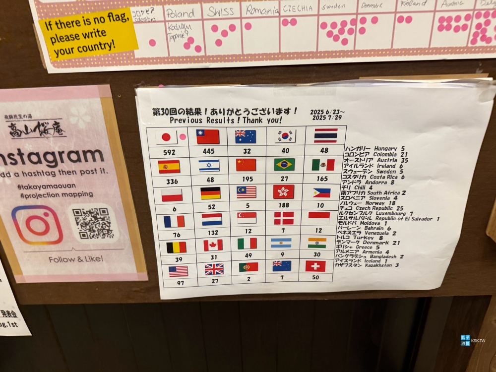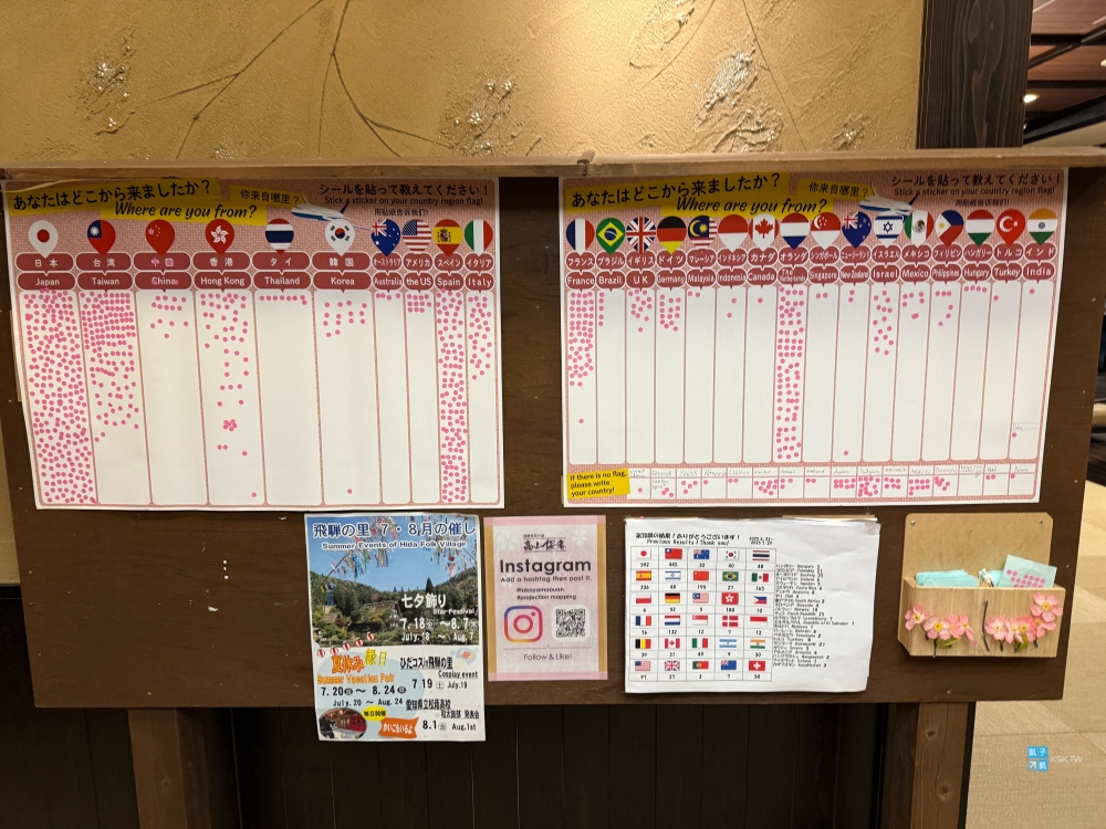「高山櫻庵」給我的感覺是…太多外國旅客了,雖然牆壁上貼紙貼最滿的還是日本人,第二名則是台灣旅客,但實際上我住宿這晚,幾乎到處都是遇到西方洋人臉孔的客人,覺得外國客住宿比例有高達七成之多。