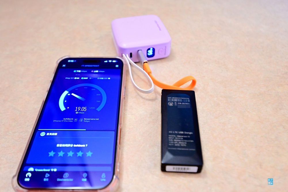 這台我實際測試是使用Softbank原生線路的網路,速度表現還不錯,除了可以放在車上使用,您平常只要幫它接個行動電源上去,也可以直接當WiFi機使用。