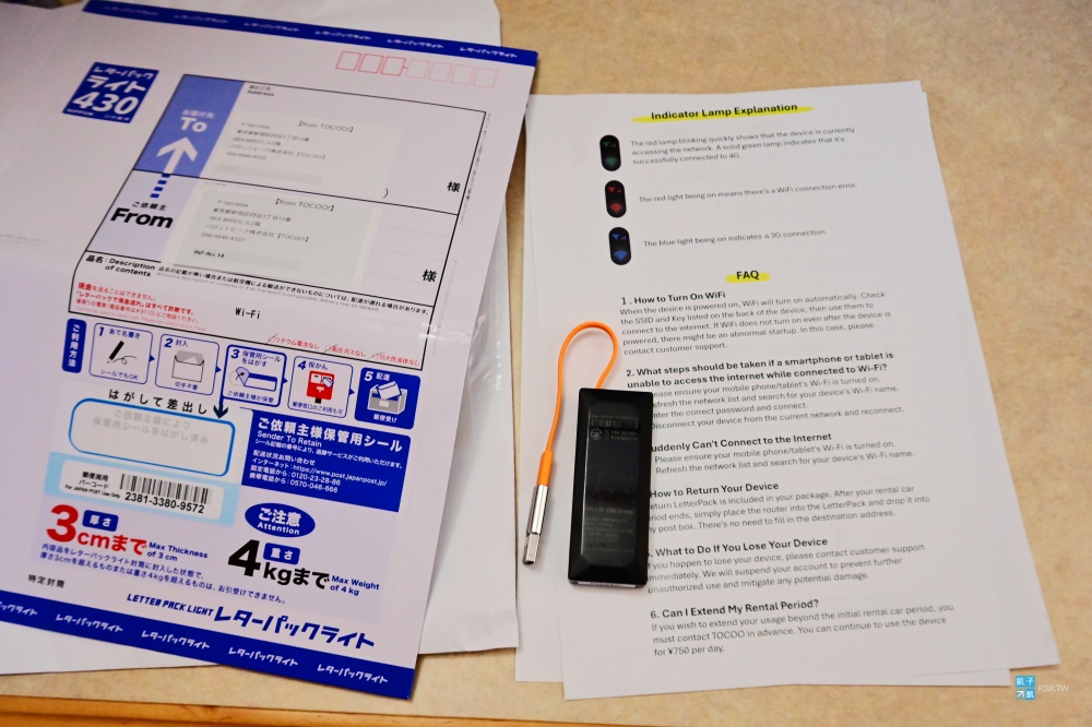 2.裡面也會附有說明書跟回郵信封,您只要在還車當天,將「車用WiFi器」塞入回郵信封,投入附近的郵筒即可。比較需要注意的是,還車當天就必須投入郵筒寄回,延遲的話會被收取一天750日圓的延誤費用。