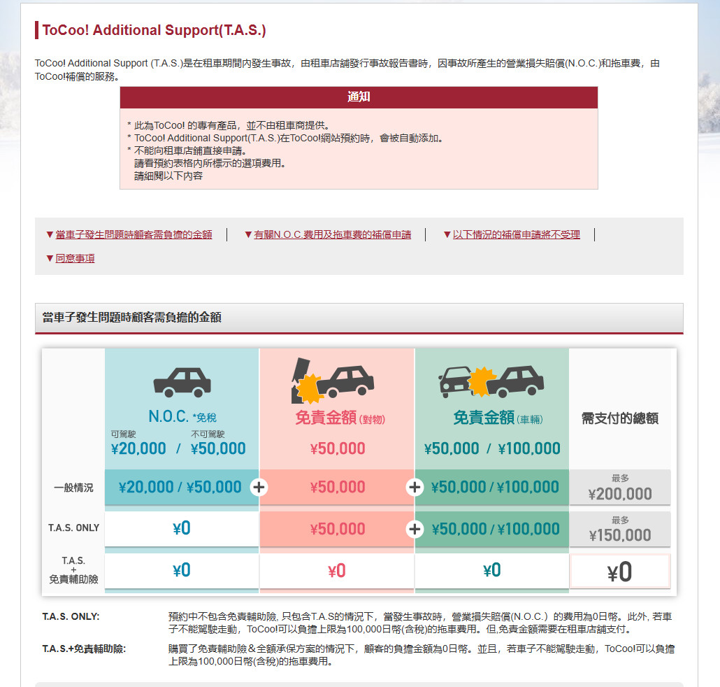 如果您是TOCOO!預約租車的話,他們家有自己推出「TOCOO! Additional Support(TAS)」,這是強制選項,主要是補償因事故所產生的營業損失賠償(N.O.C.)和拖車費。