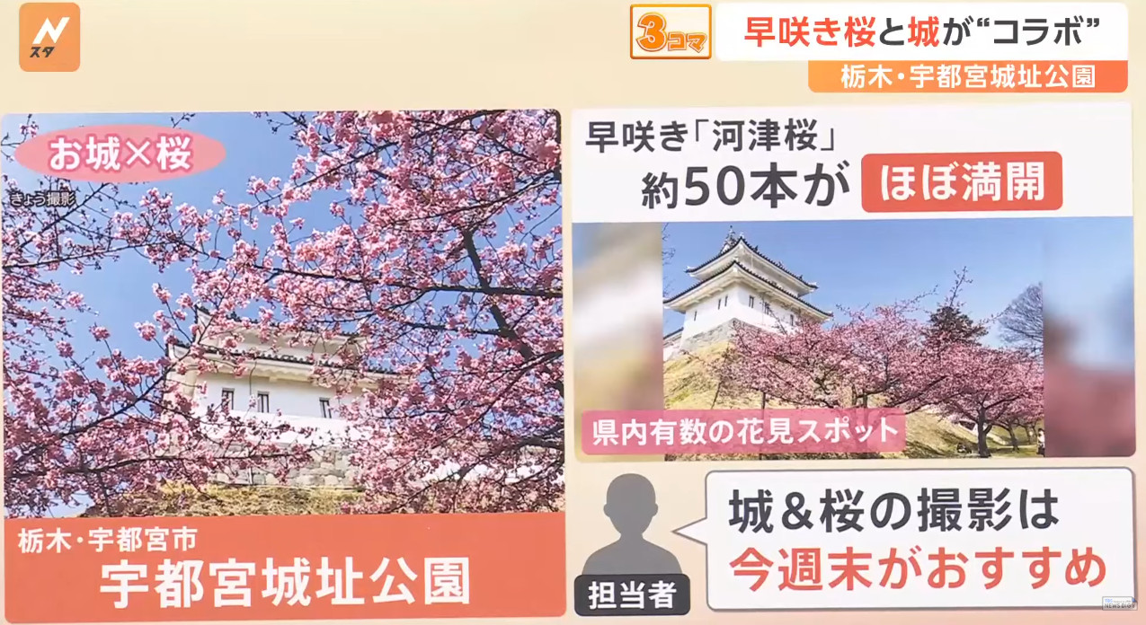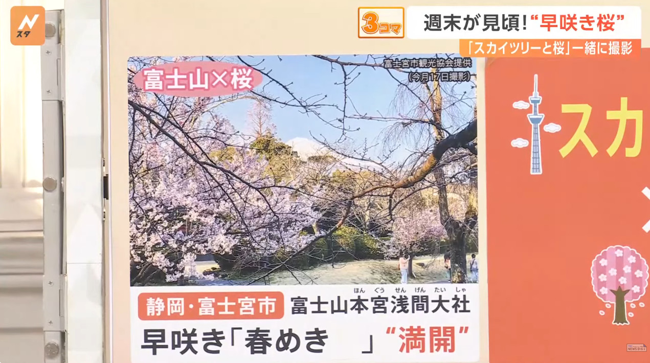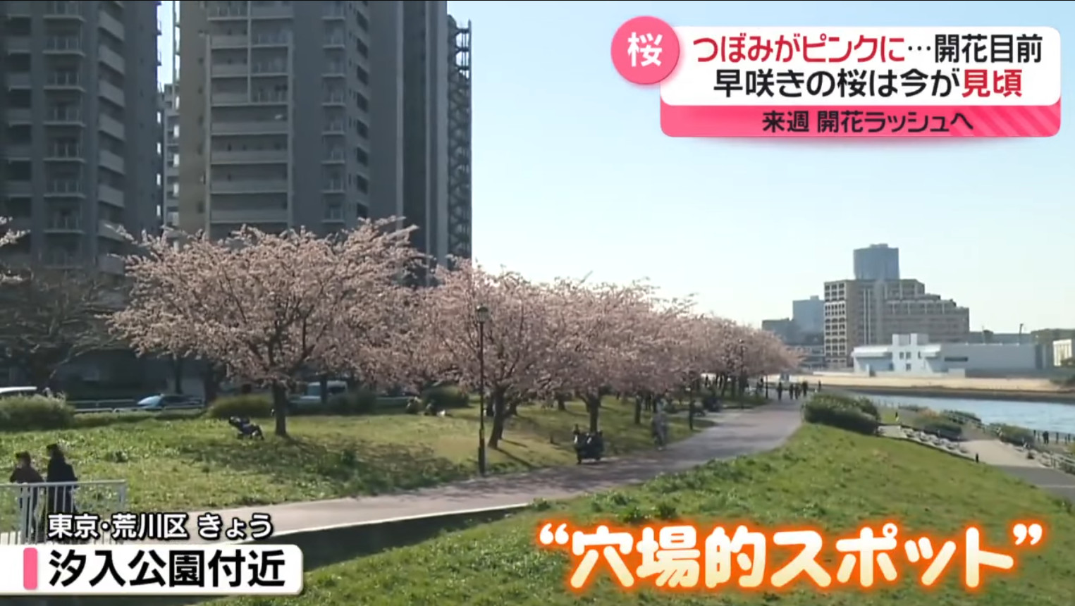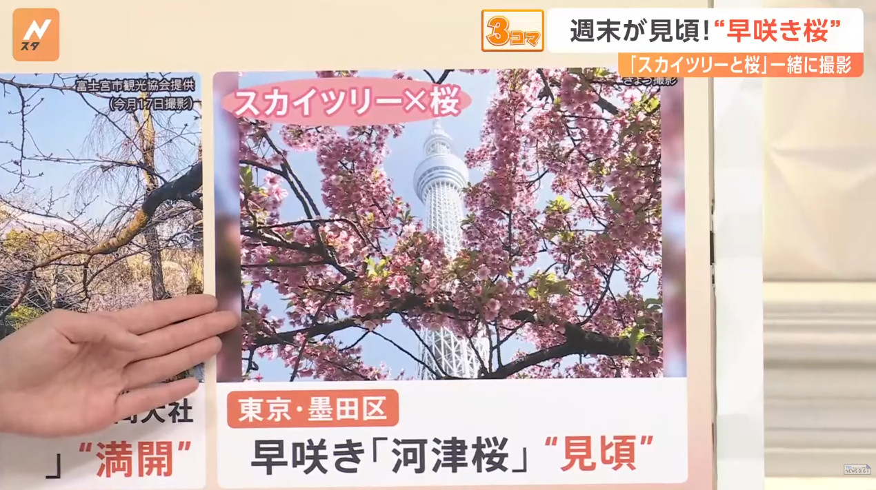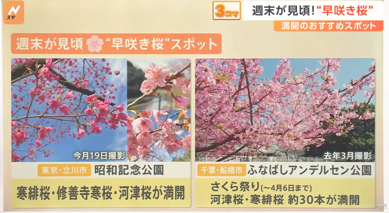 也由於櫻花品種非常多,日本新聞介紹了相當多早開品種的賞櫻景點可以跑,除了較知名上野公園、隅田公園、SKYTREE的河津櫻之外,東京汐入公園大寒櫻、港區南櫻公園、調布市神代植物園的寒緋櫻、神奈川縣南足柄市一ノ堰ハラネ的「春めき」、 靜岡富士本宮大社也有「春めき」此櫻種、埼玉久喜市長達2.5公里的河津櫻(進入尾聲)、昭和紀念公園(寒緋櫻、修善寺寒櫻、河津櫻滿開)、栃木縣宇都宮城址公園河津櫻、三重鈴鹿之森庭園垂枝梅….等賞花景點。