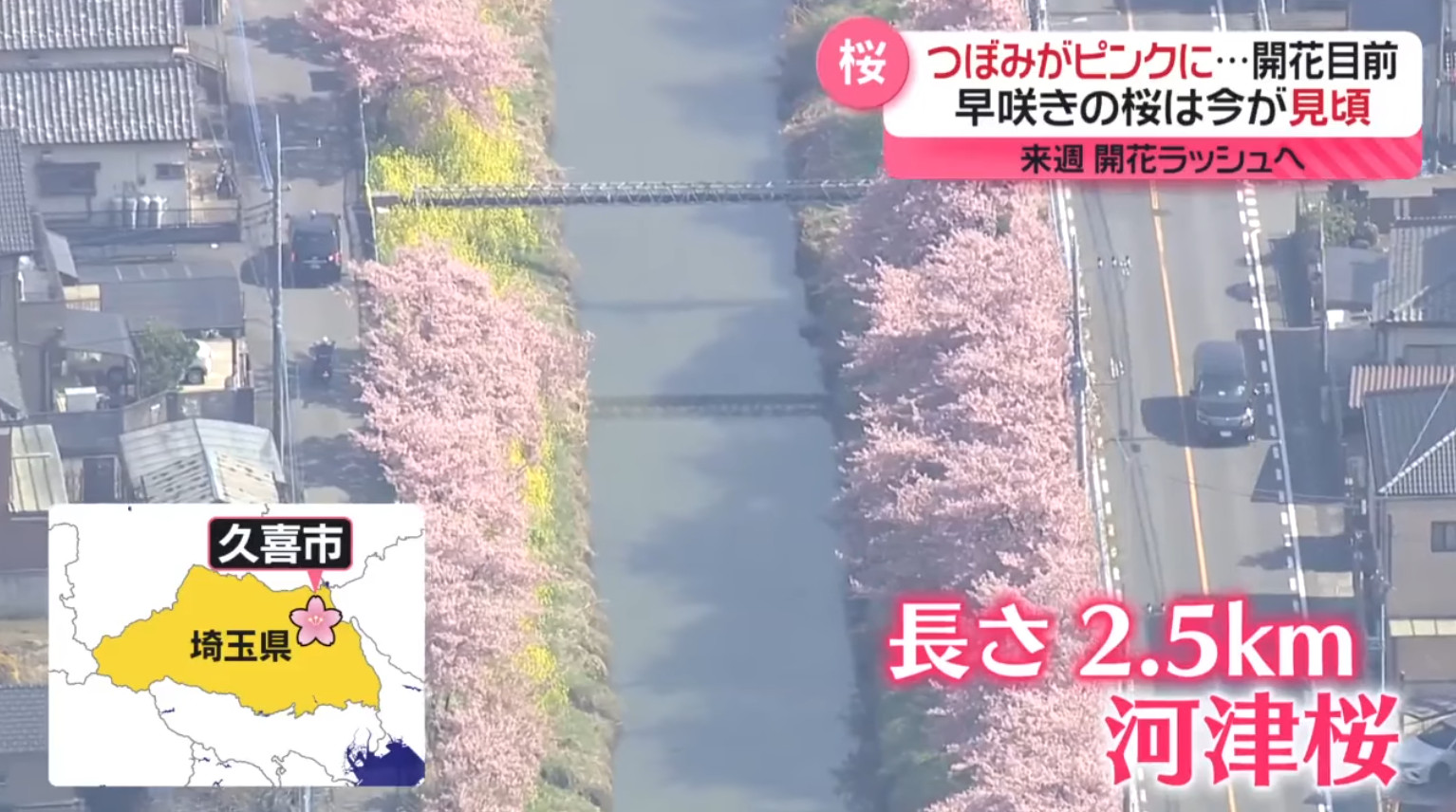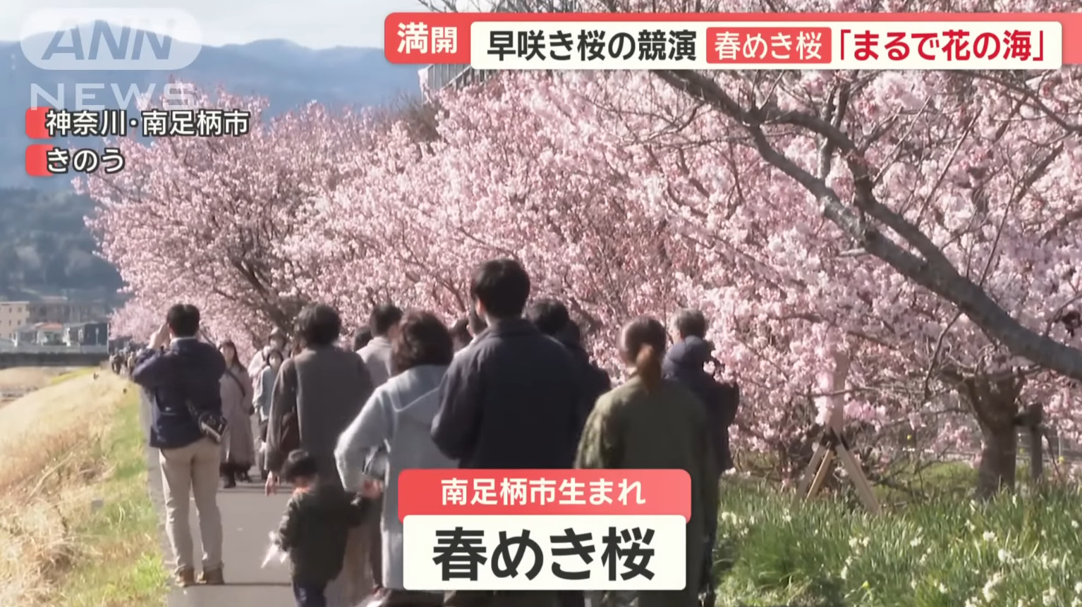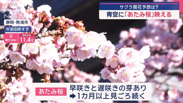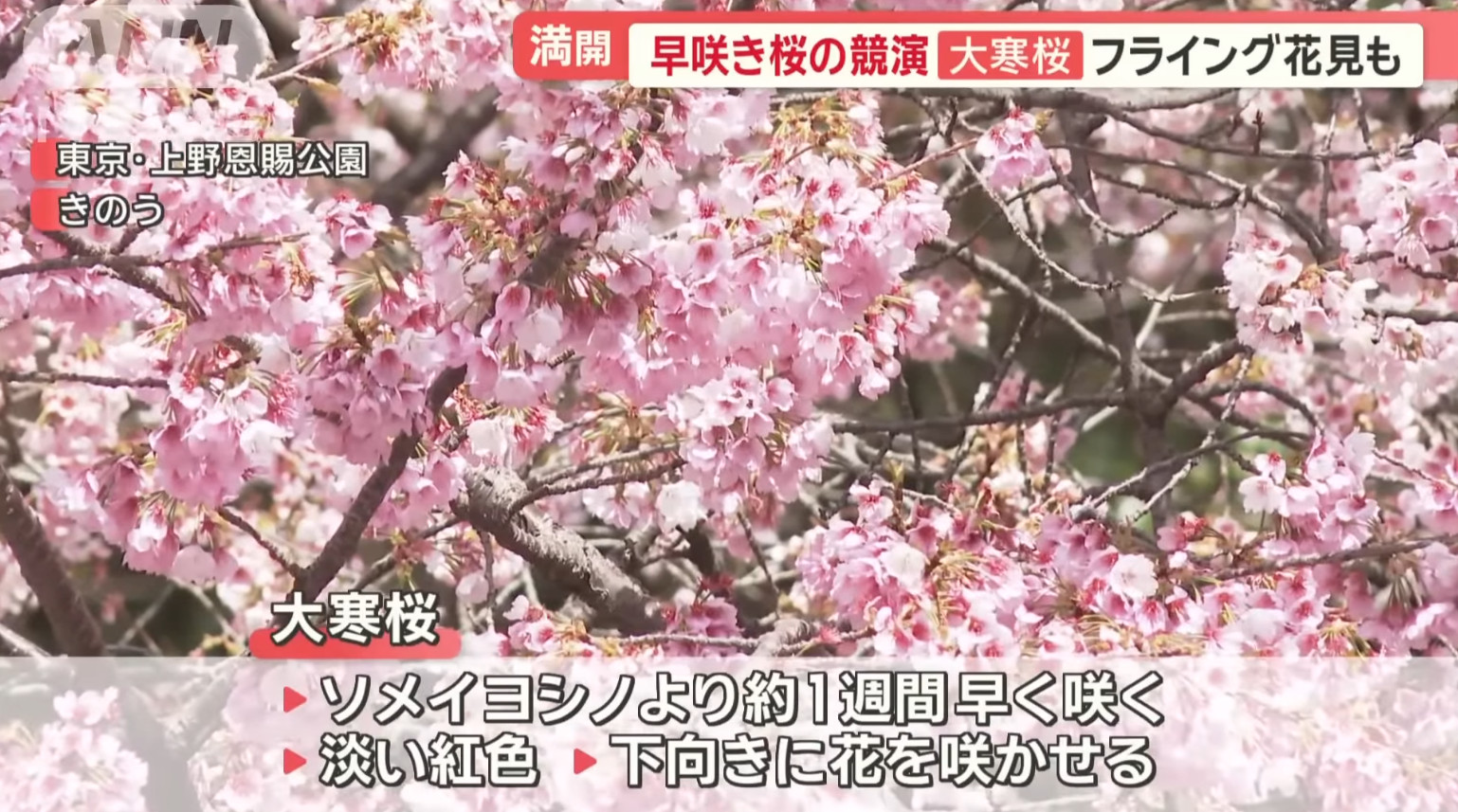 也由於櫻花品種非常多,日本新聞介紹了相當多早開品種的賞櫻景點可以跑,除了較知名上野公園、隅田公園、SKYTREE的河津櫻之外,東京汐入公園大寒櫻、港區南櫻公園、調布市神代植物園的寒緋櫻、神奈川縣南足柄市一ノ堰ハラネ的「春めき」、 靜岡富士本宮大社也有「春めき」此櫻種、埼玉久喜市長達2.5公里的河津櫻(進入尾聲)、昭和紀念公園(寒緋櫻、修善寺寒櫻、河津櫻滿開)、栃木縣宇都宮城址公園河津櫻、三重鈴鹿之森庭園垂枝梅….等賞花景點。
