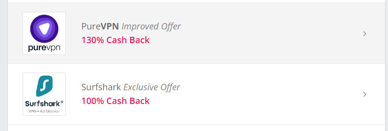 也很推薦大家透過TopCashback來購買VPN,而且VPN還蠻常在推出促銷的,像是大家常聽到的Surfshark VPN、PureVPN、NordVPN…很常是有在做活動返利接近100%,甚至還有….130%的,很誇張吧!