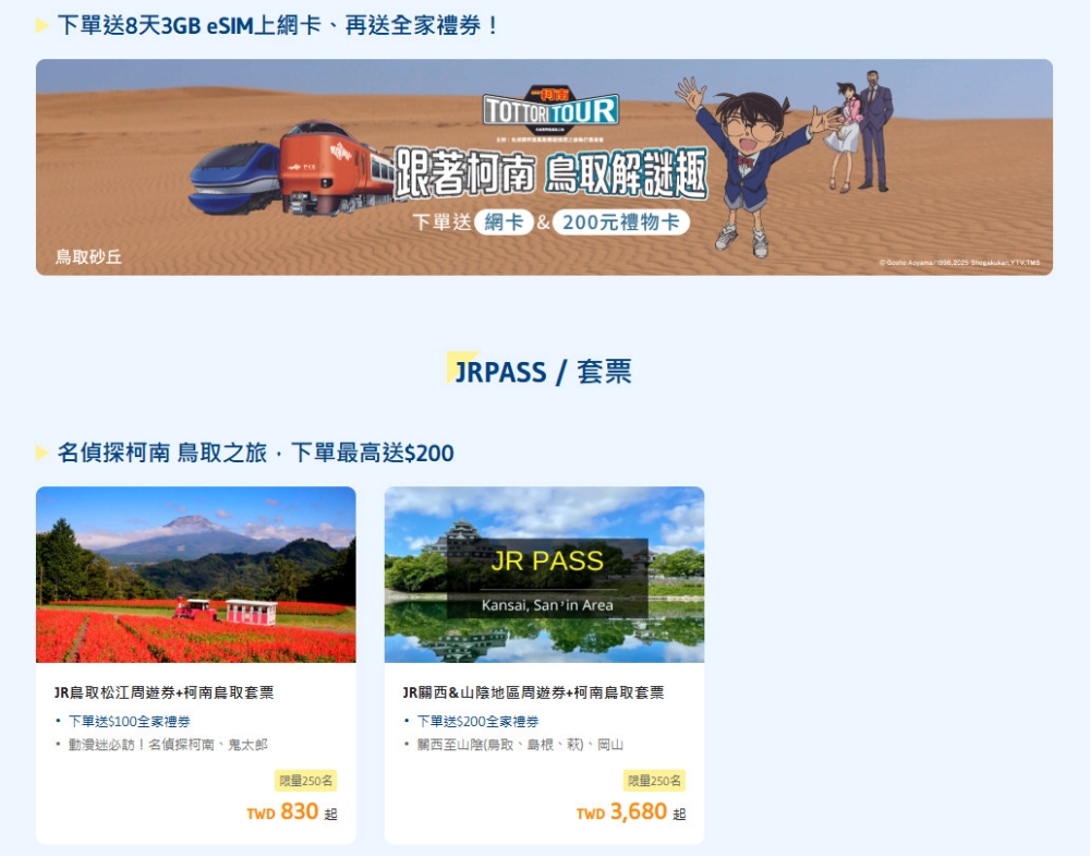 通常它都是跟隨著JR西日本的交通票券一起販售的,比如說您可以到kkday、klook、易遊網等海外旅行社購買「JR鳥取松江周遊券、JR關西&山陰地區周遊券」這兩張JR PASS都有結合「柯南鳥取套票」!