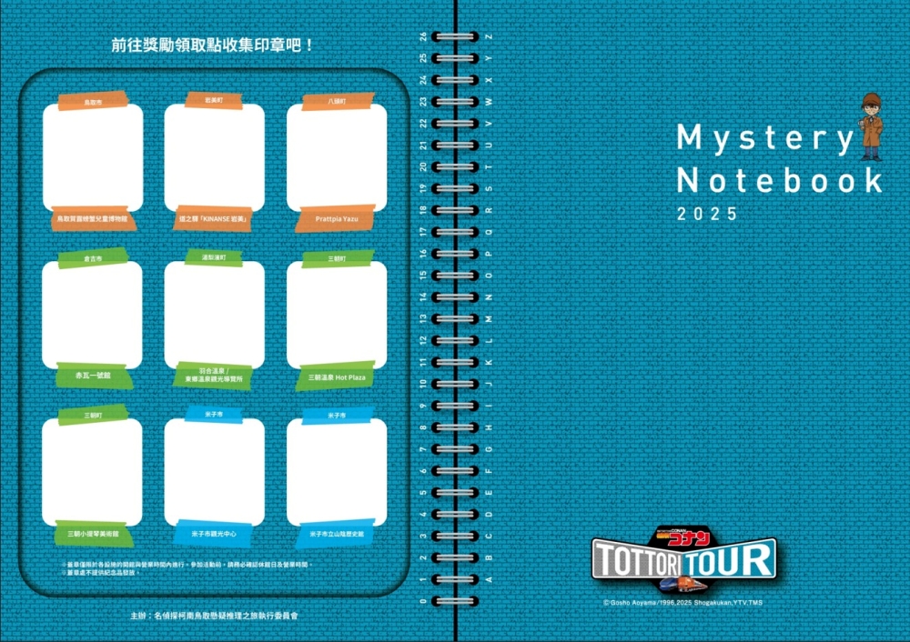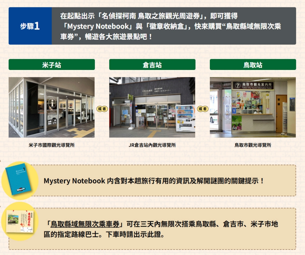 請先至以下任一兌換地點報到,並兌換領取「鳥取觀光周遊券(鳥取縣域無限次乘車券)、Mystery Notebook(解謎專用用紙)、原創徽章收納盒」。