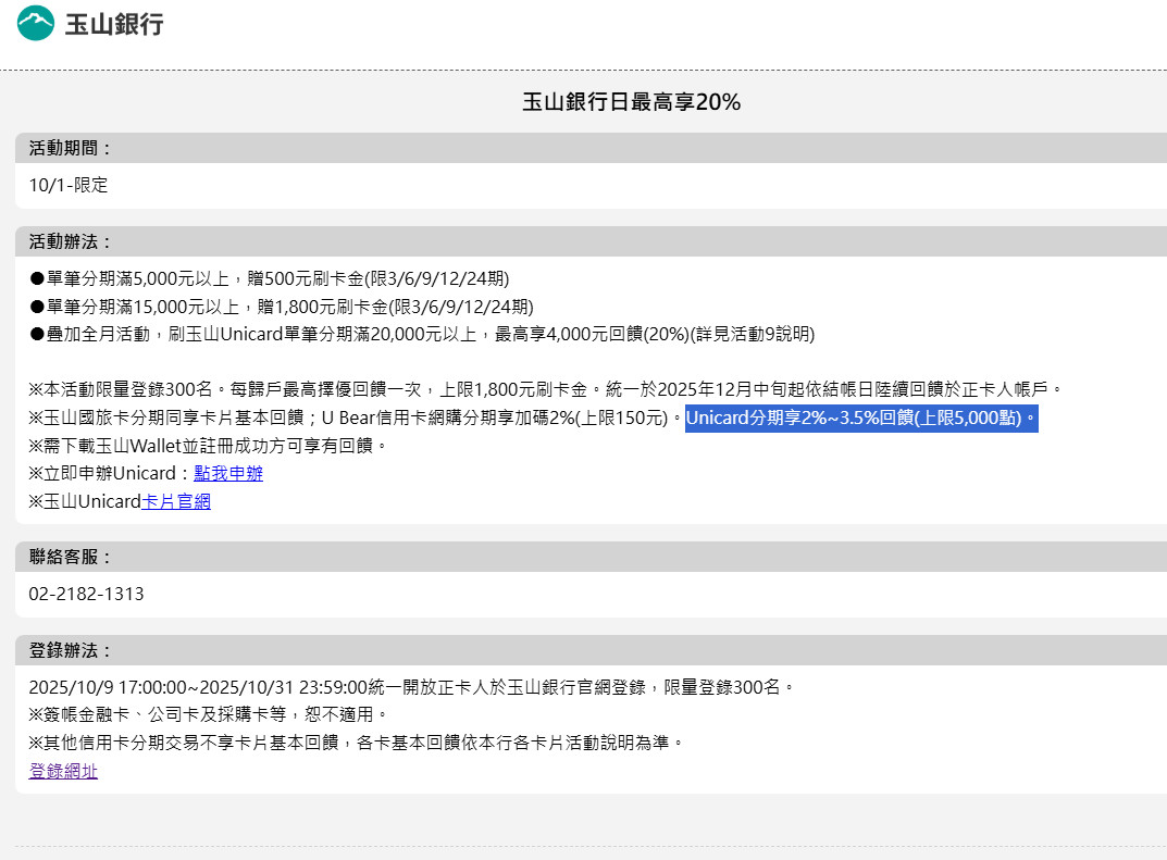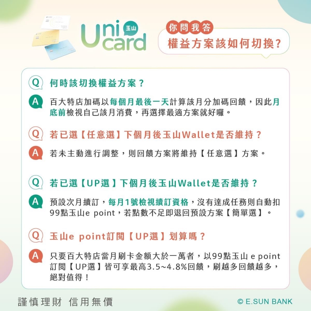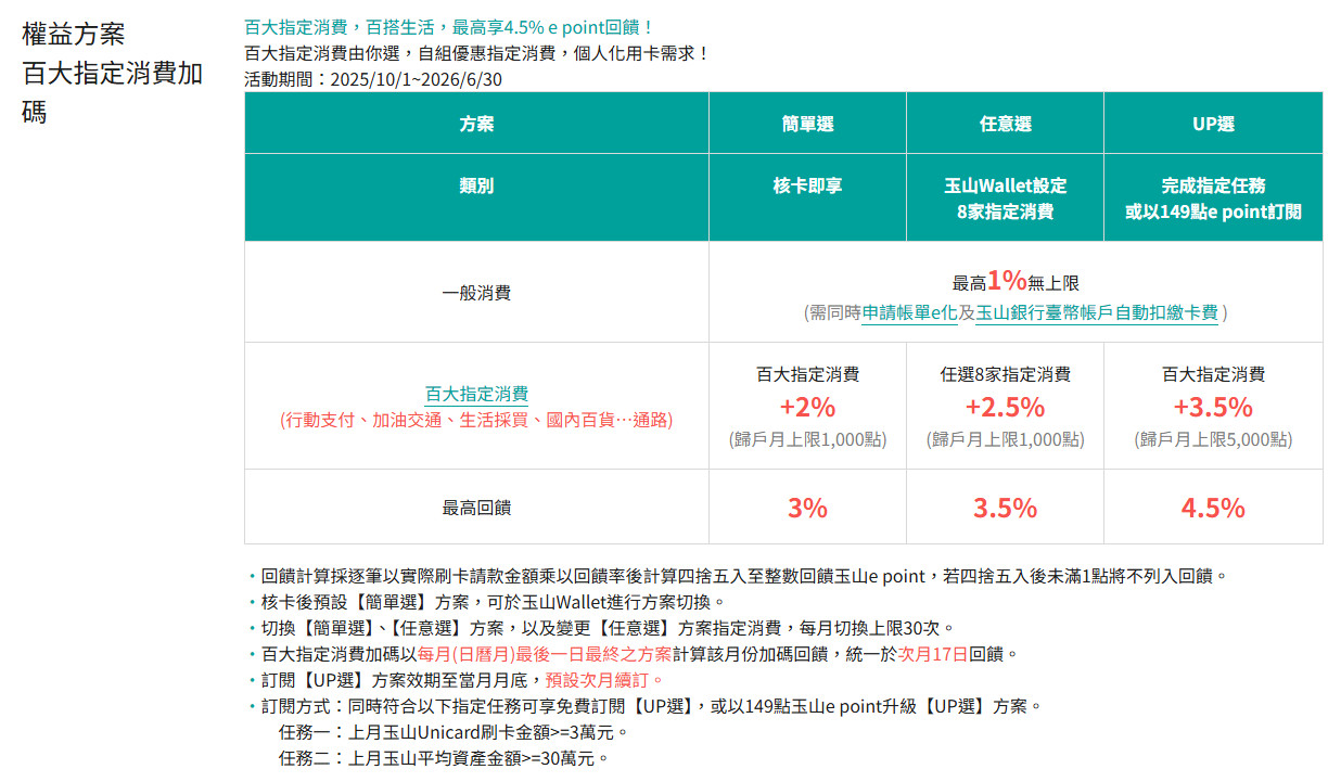 玉山2025/10/1起,把「UP選」回饋上限調高,應該會吸引更多人傾向於來賺取這額度蠻大的4.5%回饋。