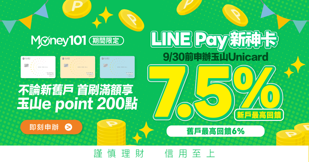 活動內容:活動期間內透過Money101專屬連結首次申辦玉山Unicard正卡,於核卡後30天內持該卡新增一般消費累積滿999元,不分新舊戶享「玉山e point200點」回饋。
