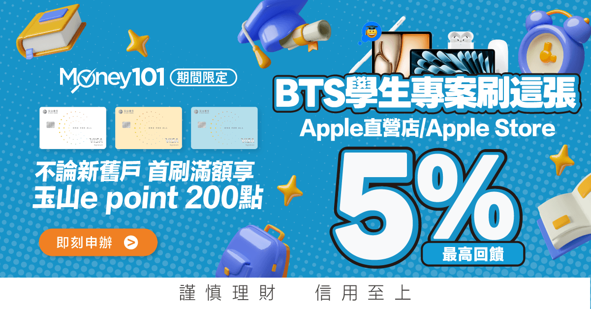 - 限透過Money101專屬連結首次申辦玉山Unicard正卡,若透過其他管道申辦,恕不符合回饋資格。