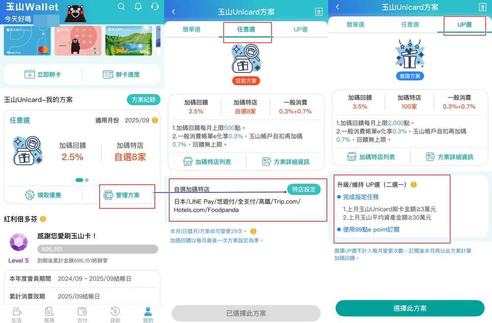 玉山今年一直在力推這張Unicard,整體用下來確實是有一定可用之處的。像是如果要用在日本的消費回饋,可以到玉山Wallet裡面將方案切換成「任意選」,然後可以自選8家,再把日本等海外國家加入”加碼特店”,這樣在這些海外國家的實體店家消費就可以輕鬆享3.5%回饋(刷2萬元達上限)。您也可以用這個方法將LINEPay等行動支付加入加碼特店裡面,這樣LINEPay支付也可以享3.5%回饋,光憑這點就很值得入手了吧!有特定大筆消費要刷的話,甚至您可以花個149點(2025/10/1起)升級到「UP選」,就可以拿4.5%回饋(刷$57143才達上限!)。