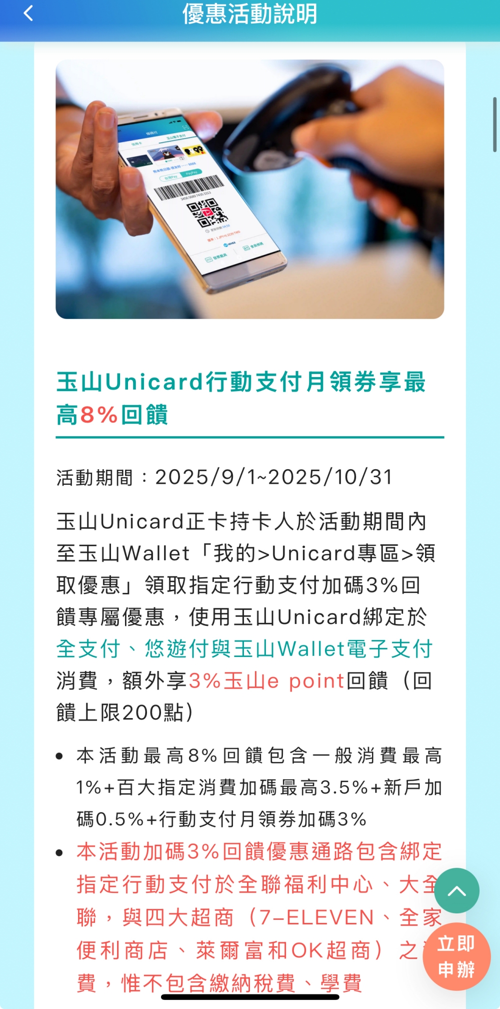 <2025.9月更新信用卡優惠訊息> 玉山Unicard卡在9月起加碼行動支付綁定於全支付、悠遊付與玉山Wallet電子支付含全聯、大全聯、四大超商消費最高8%回饋,指定旅遊通路最高8%回饋,也可搭配iPhone17新機已發表,在蘋果Apple通路最高5%回饋。
