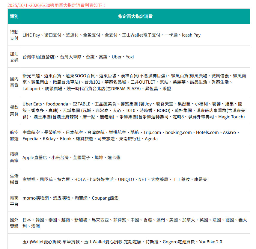 百大特店列表 https://www.esunbank.com/zh-tw/personal/credit-card/intro/bank-card/unicard#3