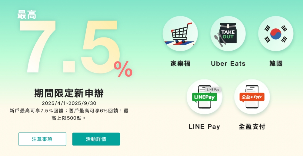 ※新戶最高7.5%包含一般消費最高1%+百大特店加碼最高3.5%+新戶加碼0.5%+期間限定新申辦指定通路加碼最高2.5%