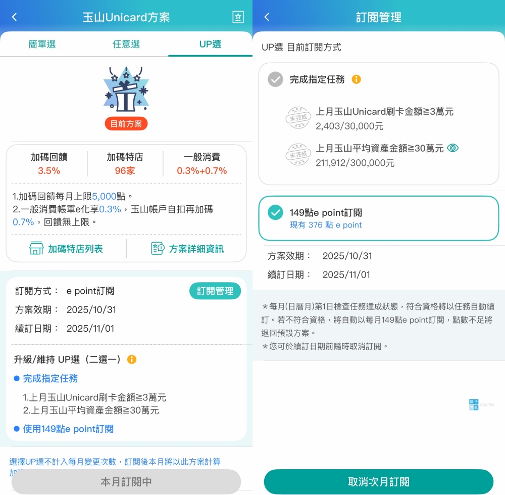 如果您這個月是使用e point去訂閱「UP選」,而且本月有用Unicard刷滿3萬元+本月玉山平均資產有達到30萬以上,那下個月就會自動幫您維持「UP選」。