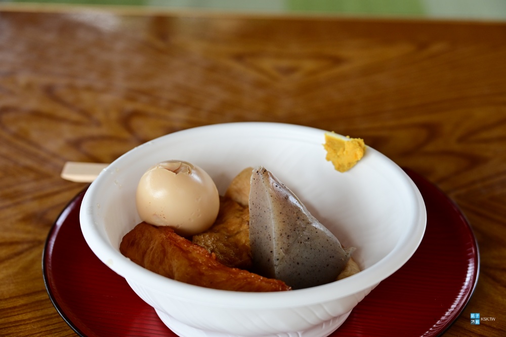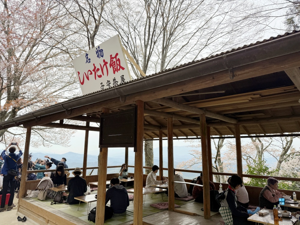 「花矢倉展望」這邊有個「子守茶屋」可以享用名物「しいたけ飯」,現場必須等一下,又或者可以簡單吃個日式關東煮。坐在露天的茶屋,一旁就可以欣賞吉野山的櫻花景色,旁邊就是展望台。